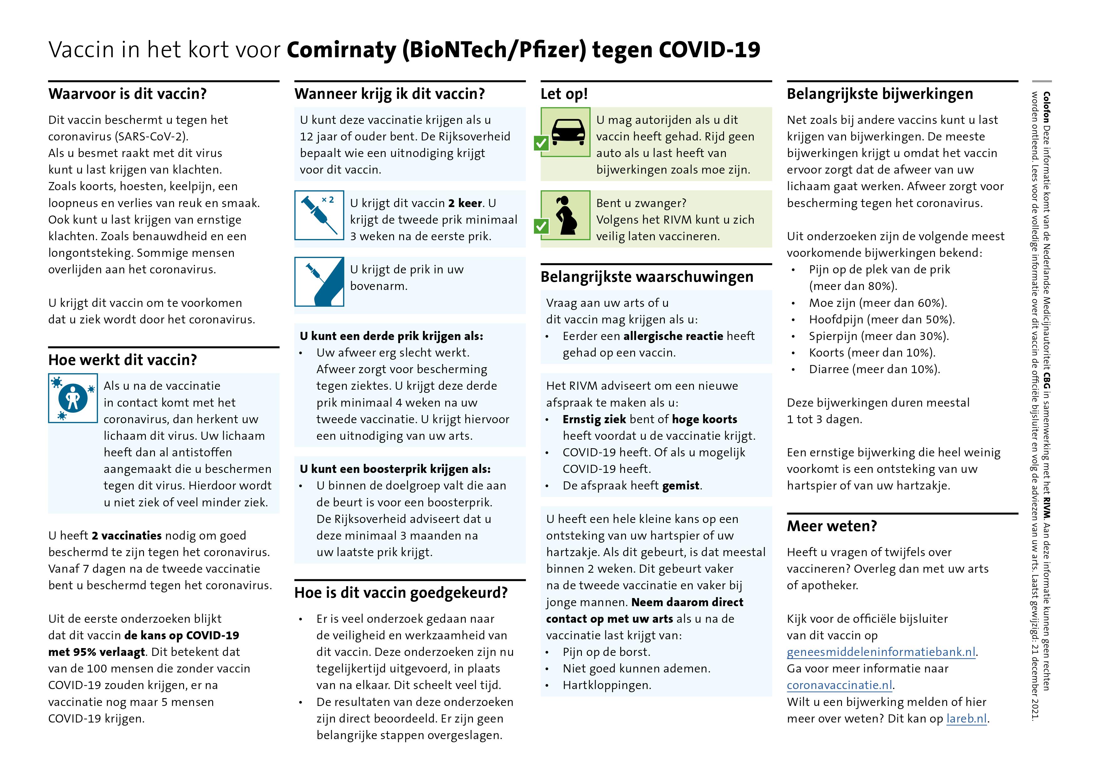 Als aanvulling op de bijsluiter introduceert het CBG het ‘Vaccin in het Kort’. Vaccin in het Kort is een nieuwe, korte vorm van informatievoorziening. Het CBG maakt deze informatiekaarten voor elk goedgekeurd coronavaccin. Het Vaccin in het Kort van de coronavaccins is beschikbaar voor de basisserie, boosterprikken en zelfs beschikbaar in verschillende talen, waaronder Fries en Turks.