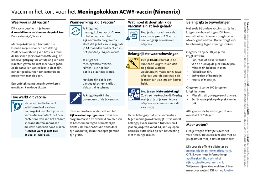 Kijk voor de officiële bijsluiter op geneesmiddeleninformatiebank.nl. Of kijk voor meer informatie op apotheek.nl, thuisarts.nl of rijksvaccinatieprogramma.nl.